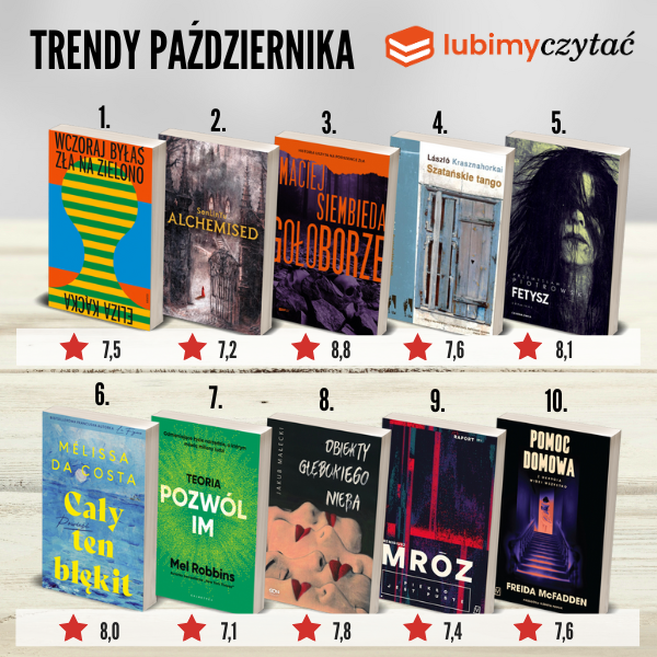 Październik upłynął pod znakiem nagród — i widać to w trendach czytelniczych. Nasze zestawienie łączy różne rejestry: od głośnych premier gatunkowych i dark fantasy po prozę nagradzaną najważniejszymi laurami. Eliza Kącka (Nike 2025) zajmuje pierwsze miejsce, a László Krasznahorkai (Nobel 2025) melduje się na czwartej pozycji. Pierwszą piątkę domykają dwa mocne kryminały i tytuł, o którym mówi cały fandom. Zapraszamy do przeglądu najpopularniejszych książek października.