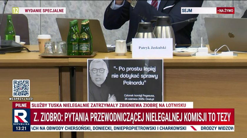 Natomiast w trakcie przesłuchania Ziobry, nagle zza stołu wstał poseł PiS Sebastian Łukaszewicz. Zawiesił przed przewodniczącą komisji śledczej ds. Pegasusa Magdaleną Sroką, kartkę z wizerunkiem Romana Giertycha oraz cytatem: "Po prostu lepiej nie dotykać sprawy Polnordu. Członek komisji Pegasua z datą: 24 czerwca 2025 r.".