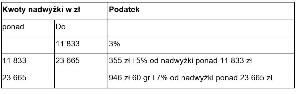 Kwota wolna dla I grupy podatkowej wynosi 36 120 zł. Od nadwyżki ponad tę kwotę podatek wynosi: