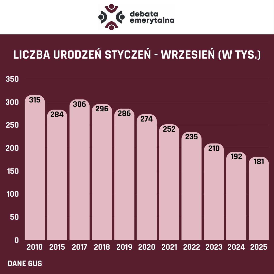 Wstępne dane GUS z 23 października 2025 roku wskazują, że w okresie styczeń́ – wrzesień́ 2025 roku (I – III kwartał) zarejestrowano ok. 181 tys. urodzeń́ żywych, czyli o ok. 11 tys. mniej niż̇ w tym samym okresie 2024 roku.