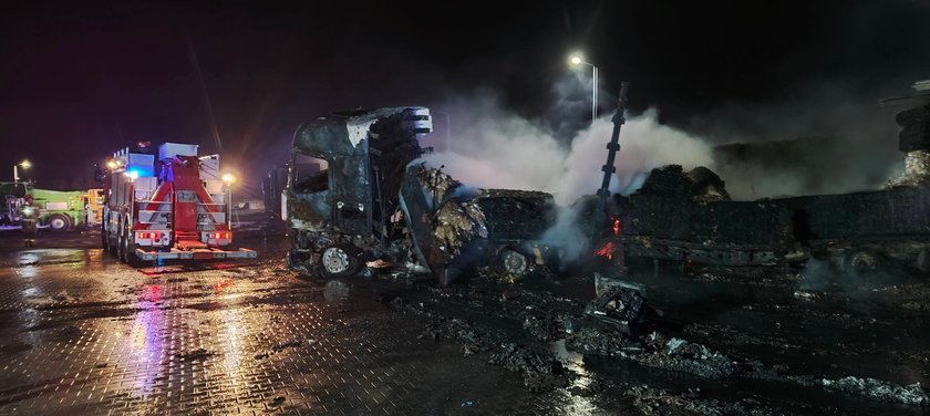 Sześć tirów z naczepami spłonęło doszczętnie w sobotni wieczór (13 grudnia) w Paniówkach (woj. śląskie). Strażacy walczyli z ogniem prawie 8 godzin. Udało się uratować jeden z kolosów oraz samochody, które znajdowały się w przylegającym do miejsca pożaru komisie. – Straty są ogromne — mówi kpt. Damian Dudek, oficer prasowy gliwickich strażaków. Na zdjęciach widać, z jak wielkim żywiołem walczyli.