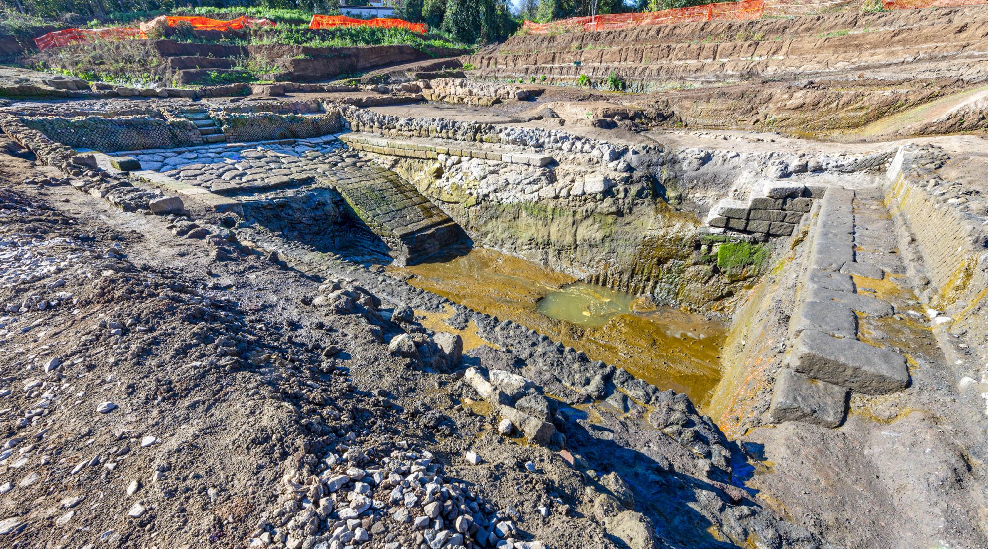 Dwa wspomniane baseny imponują rozmiarami. Jeden z nich ma 28x10 metrów i 2,1 metra głębokości. Sądząc po technice wykonania, opus incertum, powstał w II wieku p.n.e. W I wieku naszej ery przestał być wykorzystywany, a ostatecznie opuszczono to miejsce w II wieku. Nie wiadomo, do czego służył. Na podstawie wykorzystanych materiałów, fragmentów ceramiki i graffiti prawdopodobnie miał on znaczenie religijne lub gromadzona woda służyła do aktywności gospodarczej. Zasilany był systemem kanałów. Drugi z basenów jest mniejszy (21,9,2 metry), ale jego głębokość sięga 4 metrów). Powstał pod koniec II wieku p.n.e., a sto lat później dodano doń kolejne ściany oraz rampy. Ta struktura jest bardziej tajemnicza, gdyż nie znaleziono systemu zasilającego ją w wodę. Już wcześniej znajdowano podobne baseny z III wieku p.n.e. odnośnie których wysunięto hipotezę, że służyły celom kultowym. Na podstawie materiału, którym basen został zasypany, archeolodzy stwierdzili, że przestano zeń korzystać w II wieku naszej ery.