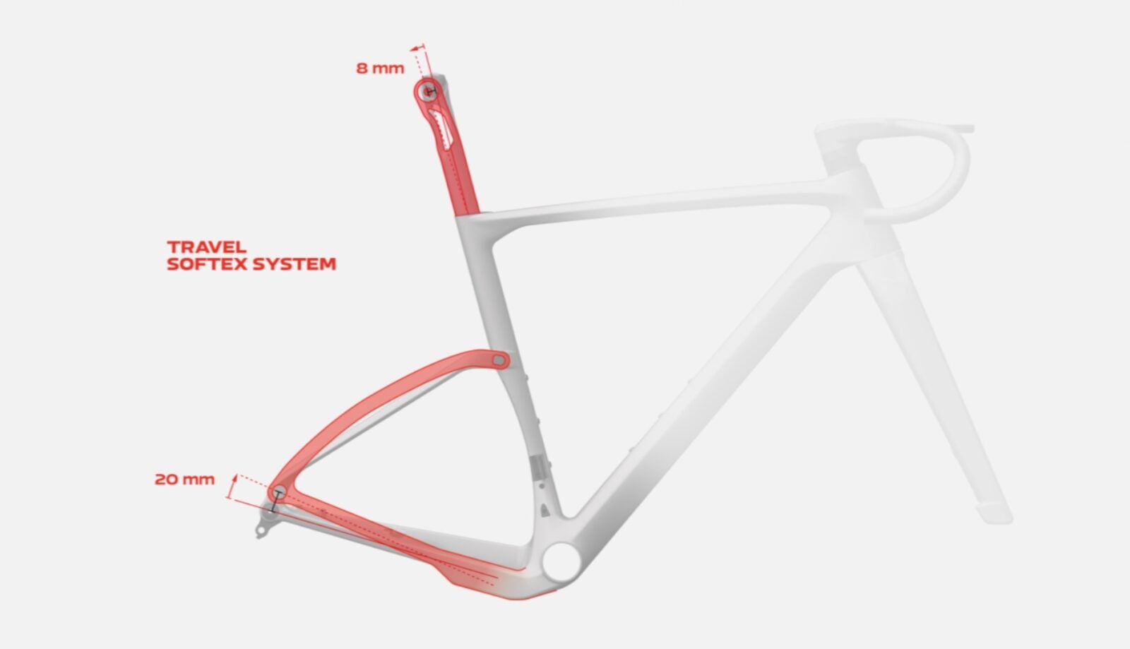 Tym, co jednak naprawdę wyróżnia rower Naii na tle konkurencji, jest jednak zawieszenie Softex, a więc subtelny, ale skuteczny system amortyzacji tylnego trójkąta, który działa tam, gdzie widełki łączą się z rurą podsiodłową. Jego wyjątkowość drzemie w tym, że działa na zasadzie kontrolowanego ugięcia konstrukcji, zapewniając do 20 mm skoku pionowego. Uzupełnia go specjalna sztyca Tibia Aero z dodatkowym zakresem pracy 8 mm. Tego typu technologia flex zone nie jest jednak dla Berrii nowością, bo producent testował ją już z powodzeniem w serii rowerów górskich Bravo, gdzie zyskała uznanie za umiejętne łączenie komfortu i kontroli. Teraz to doświadczenie producent przeniósł do świata gravela i efektem tego jest większa redukcja drgań, mniejsze zmęczenie i lepsza wydolność na długich, wyboistych trasach.