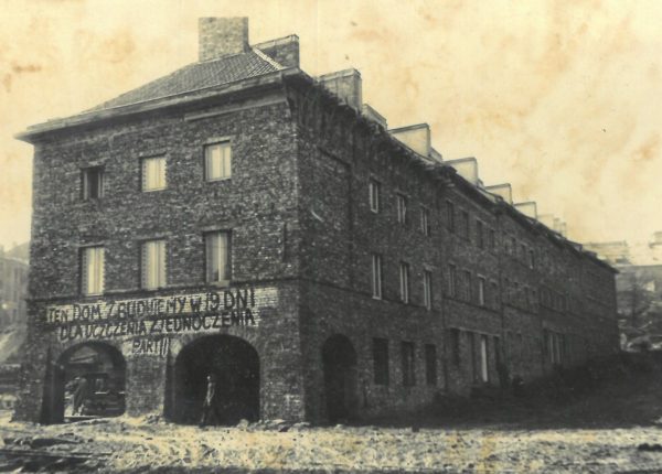Ulica Mariensztat, kamienica z napisem propagandowym „Ten dom zbudujemy w 19 dni dla uczczenia zjednoczenia partii.”