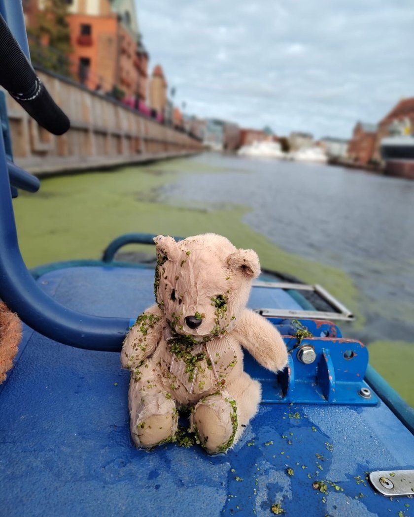 Pluszowy bohater z Motławy. Niby przemoczony, ale wciąż z godnością. Czeka na swojego człowieka, albo nowy dom.
