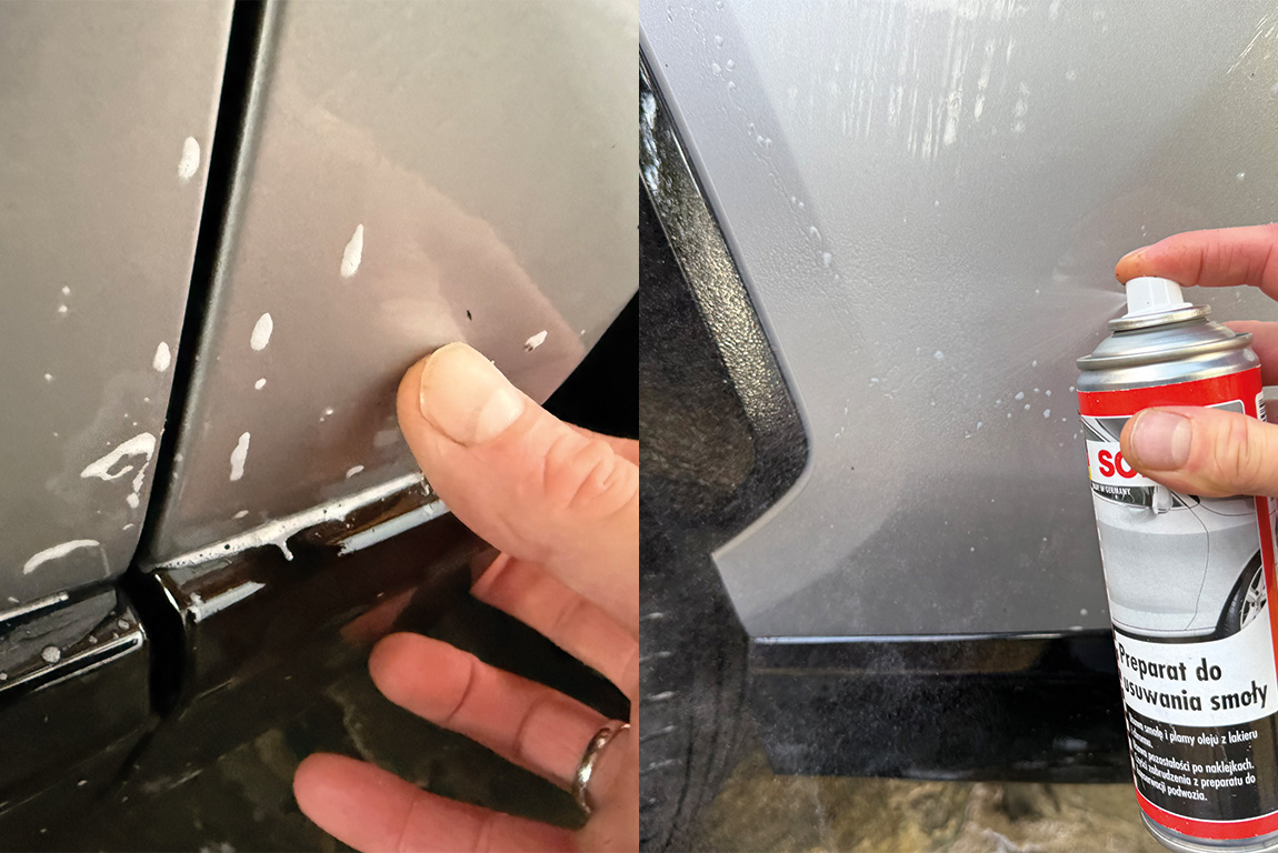 Ja ze zdziwieniem odkryłem na błotnikach swojego samochodu czarne kropki, które ani nie zeszły pod wpływem wody pod ciśnieniem, ani nie chciały zmyć się gąbką i szamponem. Mocniej szorować? Lepiej nie! To prawdopodobnie drobinki smoły „złapane” latem podczas jazdy po miękkim asfalcie. Inaczej niż ptasie odchody, smoła nie reaguje jednak z lakierem, więc jeśli nie masz pod ręką odpowiedniej chemii, zostaw to na inną okazję – to tylko kwestia estetyczna. Ja miałem w garażu spray do usuwania smoły i po 2 minutach czarne kropki zeszły już łatwo. Można też próbować sprejem do usuwania kleju po naklejkach albo preparatem do zmywania żywicy z lakieru.