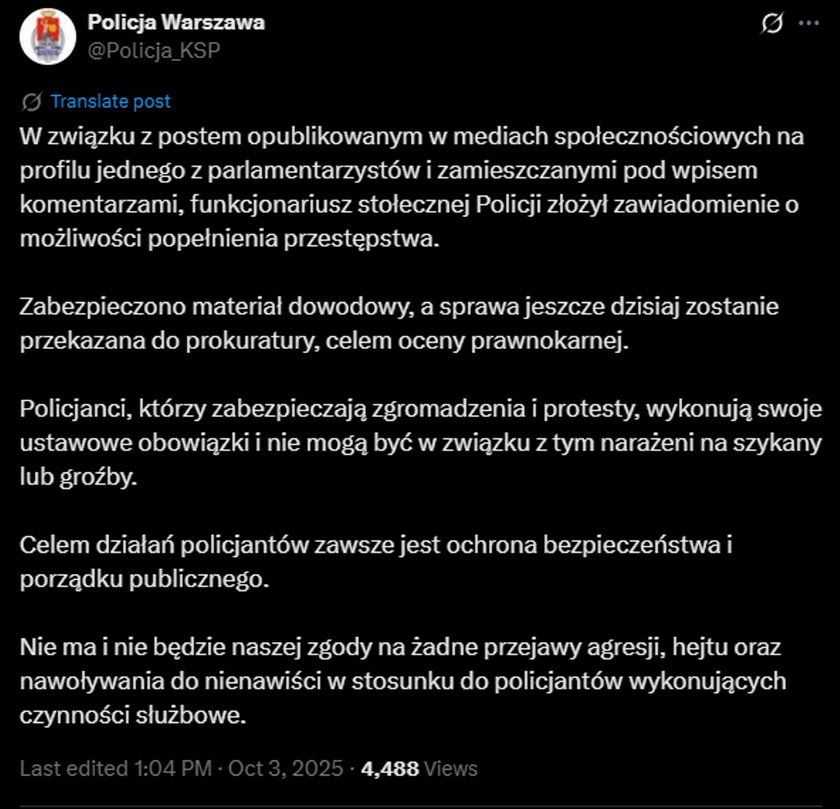 "W związku z postem opublikowanym w mediach społecznościowych na profilu jednego z parlamentarzystów i zamieszczanymi pod wpisem komentarzami, funkcjonariusz stołecznej Policji złożył zawiadomienie o możliwości popełnienia przestępstwa" — przekazano. Dodano, że materiał dowodowy został już zabezpieczony, a sprawa jeszcze w piątek (3 października) "zostanie przekazana do prokuratury, celem oceny prawnokarnej".