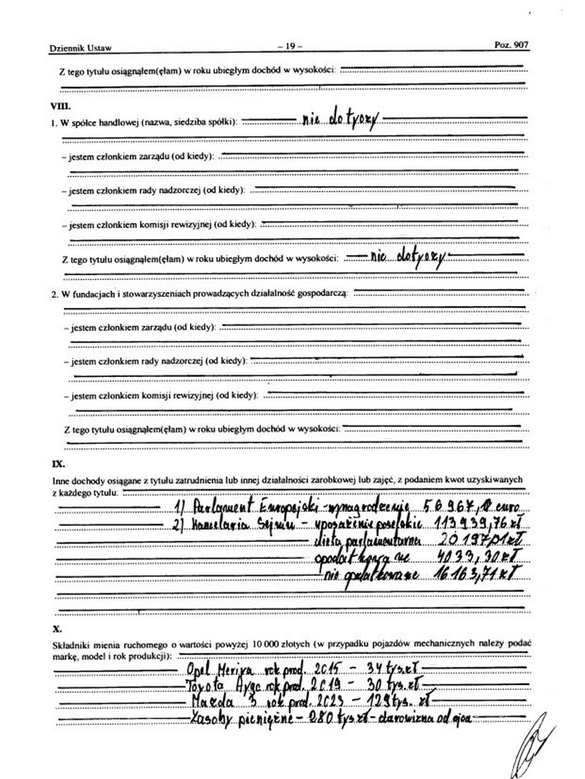 W garażu trzyma Opla Merivę z 2015 r. Toyotę Aygo z 2019 r. oraz Mazdę 3 z 2023 r. W majątku ruchomym zapisał również darowiznę od ojca — 280 tys. zł. Parlamentarzysta ma czyste konto, jeśli chodzi o zobowiązania — nie posiada żadnych kredytów ani pożyczek przekraczających 10 tys. zł.